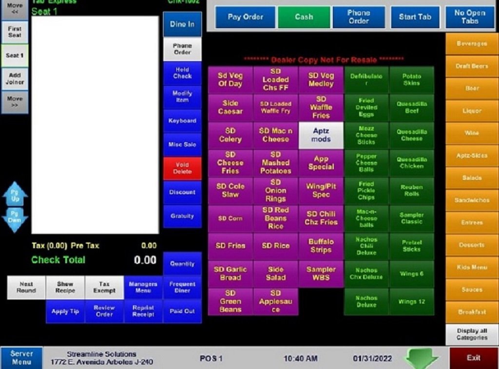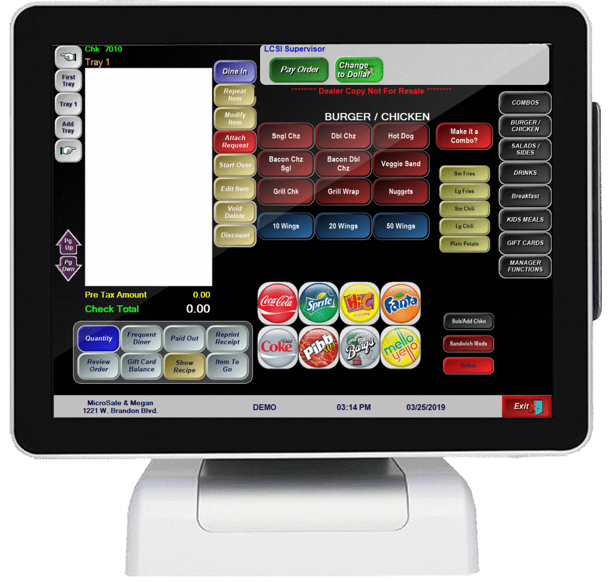 Established 30 years in 14,000 locations, Full featured for Fine Dining, Bars, Fast Food, Delivery with Employee & Menu item sales tracking, 45 item keys per screen 2x more than others for super fast ordering, Time clock with Payroll reports, Extensive Financial Reports, Inventory food cost, Email Marketing, Online Ordering, Delivery Maps, Quickbooks, Credit Card processing, & more. Go to www.Microsale.net for more info